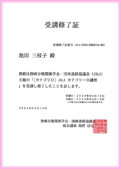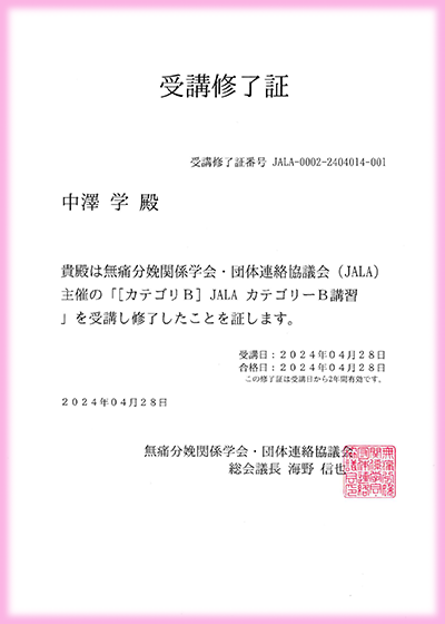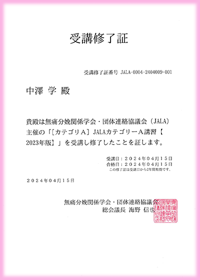 安全な医療をご提供できるように、無痛分娩についてのマニュアルを作成し、必要な機材を設置しております。また必要な講習等を受講したり院内のトレーニングを行ったりすることにより、無痛分娩に関わる全てのスタッフが常に研鑽を積むよう努めております。
